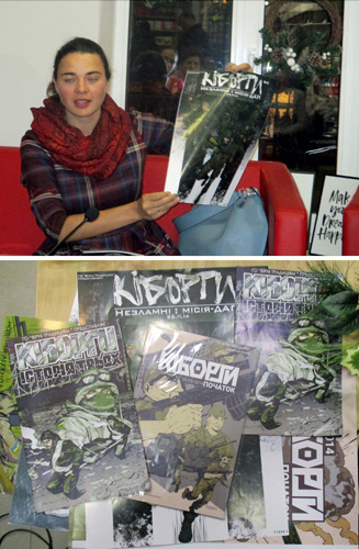 5 листопада в столичн╕й книгарн╕ «╢» до Дня Збройних Сил Укра╖ни в╕дбулася презентац╕я ком╕кс╕в сер╕╖ «К╕борги». Модератором заходу виступила журнал╕стка Наталя Федечко. Вона розпов╕ла ╕стор╕ю створення ком╕кс╕в про сучасних укра╖нських геро╖в. У Львов╕ було засновано громадську орган╕зац╕ю «В╕рн╕ традиц╕ям» для псих╕чно╖ реаб╕л╕тац╕╖ наших во╖н╕в, як╕ захищали Укра╖ну на Донбас╕. Хлопц╕ почали розпов╕дати реаб╕л╕тологам про бо╖ в Донецькому аеропорту. Реаб╕л╕тологи записували ц╕ розпов╕д╕. Виникла ╕дея оприлюднити ╖х для широко╖ громадськост╕. Вир╕шили обрати форму ком╕кс╕в. Ком╕кси розпов╕дають про супергеро╖в – Кап╕тана Америку, Супермена, Спайдермена. До реч╕, перш╕ ком╕кси про Спайдермена малював укра╖нець Ст╕в Д╕тко (справжн╓ пр╕звище Д╕дько). Д╕дусь розказував йому на н╕ч казки, щоб малюк не забув укра╖нську мову. Нев╕домо, але, можливо, д╕д розказував ╕ про якогось козака Павука. Захисники Донецького аеропорту ╓ справжн╕ми супергероями. В аеропорт прибули 73 б╕йц╕ 3-го окремого полку. З них лише бо╓ць з позивним «Турист» брав участь у миротворчих операц╕ях в ╤раку. Решта зовс╕м не мала бойового досв╕ду. 25 травня 2014 року, коли в Укра╖н╕ в╕дбувалися вибори президента, в аеропорт вступила тисяча рос╕йських спецпризначенц╕в. Серед них було 26 ╕нструктор╕в, як╕ вже воювали в Чечн╕. Рос╕яни зайняли новий терм╕нал. Наш╕ пов╕домили командуванню. Командування попрохало триматися. Якби в аеропорту приземлилася рос╕йська ав╕ац╕я, то насл╕дки для Укра╖ни були б катастроф╕чними. Рос╕яни ставили пости: «Кохана, я привезу тоб╕ голову укропа». Вони були впевнен╕, що 26 травня захоплять аеропорт. Наш╕ в╕йськовики були переважно родом з К╕ровограда, рос╕йськомовн╕. Це вже пот╕м вони принципово перейшли на укра╖нську мову. А тод╕ вони воювати проти рос╕ян не хот╕ли. Володя з позивним «Воха», сирота з К╕ровограда, не м╕г пов╕рити, що доведеться воювати з рос╕йськими братами. Але саме в╕н зробив перший постр╕л. 26 травня о перш╕й годин╕ на аеродром с╕дав укра╖нський гел╕коптер з 25-ма б╕йцями на борту. «Воха» пом╕тив, що один ╕з рос╕йських спецпризначенц╕в нац╕лив «╤глу» на наш гел╕коптер. Тод╕ «Воха» застрелив трьох рос╕йських спецпризначенц╕в, як╕ хот╕ли збити укра╖нський гел╕коптер. Наш╕ за ш╕сть дн╕в жорстоких бо╖в зачистили новий терм╕нал ╕ вигнали рос╕ян. Хлопц╕ перехопили рад╕оперемовини рос╕йських спецпризначенц╕в: «Я, бл╕н, не знаю, хто захища╓ Донецький аеропорт, але ми ╖х вибити не можемо!.. Пробували штурмувати – нам так вломили – ми в╕д╕йшли… Почали накривати «градами» - вони п╕рнають в п╕дземн╕ колектори канал╕зац╕╖… Я не знаю, хто там… Це не люди – це к╕борги…» ╤ захисник╕в Донецького аеропорту стали називати к╕боргами. Нин╕ цю спецоперац╕ю вивчають в збройних силах ╤зра╖лю ╕ США. Ком╕кси гарно сприймаються ╕ д╕тьми, ╕ дорослими. ╤люстратором ком╕кс╕в «К╕борги» став Левко Кв╕т з╕ Львова. Перед виданням ком╕кс показують к╕боргам. Вони уважно вичитують ╕ пильнують, щоб малюнкова ╕стор╕я була правдивою. Наталка Федечко говорить, що ком╕кси адресован╕ студентам ╕ хлопцям 9-10-х клас╕в, але й учн╕ 3-4-х клас╕в читають ╕ поширюють ц╕ ╕люстрован╕ ╕стор╕╖ серед однокласник╕в. У Львов╕ поширенням ком╕кс╕в захопила
