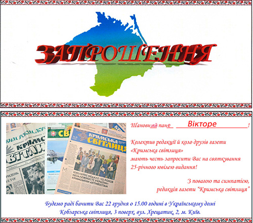К╕лька дн╕в тому я, головний редактор газети «Кримська св╕тлиця» з 2000 року, зв╕льнений у травн╕ 2016 р. ки╖вським начальством з╕ штату редакц╕╖ з посади головного редактора з формулюванням «за прогули», отримав через соц╕альну мережу Facebook ось це запрошення. Вчитаймося: «Шановний пане В╕кторе! (Отже, це таки справд╕ мен╕, то не помилка, т╕льки з яких це п╕р редактор-прогульник став для вас шановним?) Колектив редакц╕╖ й коло друз╕в газети «Кримська св╕тлиця» мають честь запросити Вас на святкування 25-р╕чного юв╕лею видання! Будемо рад╕ бачити Вас 22 грудня о 15.00 годин╕ в Укра╖нському дом╕, Кобзарська св╕тлиця, 3-й поверх, вул. Хрещатик,2, м. Ки╖в. З повагою та симпат╕╓ю, редакц╕я газети «Кримська св╕тлиця».