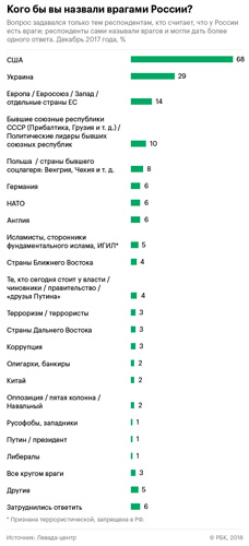 Дв╕ третини рос╕ян вважають, що сьогодн╕ у Рос╕╖ ╓ вороги, головними з яких ╓ США, Укра╖на ╕ ╢вропа. Про це св╕дчить опитування Левада-центру, проведене на початку грудня 2017 року, пов╕домля╓ РБК. 66% респондент╕в в╕дпов╕ли ствердно на питання, чи ╓ у нин╕шньо╖ Рос╕╖ вороги, а 21% заперечу╓ ╖х наявн╕сть. Частка тих, хто вважа╓, що у Рос╕╖ ╓ вороги, виявилася м╕н╕мальною з 2012 року - тод╕ про це заявили 63% опитаних. Рекордний результат за 23 роки досл╕джень з цього питання було заф╕ксовано в 2014 роц╕ – тод╕ цю позиц╕ю под╕ляли 84% респондент╕в. Головними ворогами Рос╕╖ респонденти назвали США (68%), Укра╖ну (29%) ╕ ╢вросоюз (14%). Дал╕ йдуть колишн╕ республ╕ки СРСР (10%), Польща (8%), Н╕меччина, НАТО ╕ Англ╕я (по 6%), прихильники "╤сламсько╖ держави" (5%), держави Близького Сходу (4%). Т╕, хто сьогодн╕ перебува╓ при влад╕ – чиновники, уряд, "друз╕ Пут╕на" – набрали 4%. Серед "аутсайдер╕в" рейтингу ворог╕в, за верс╕╓ю рос╕ян, – терористи, кра╖ни Далекого Сходу, корупц╕я (у них по 3%). Респонденти давали й екзотичн╕ в╕дпов╕д╕ (╖хн╕й результат не перевищу╓ статистично╖ похибки). Наприклад, ворогами Рос╕╖ 2% опитаних вважають "опозиц╕ю / п'яту колону / засновника Фонду боротьби з корупц╕╓ю Олекс╕я Навального". По 1% чи менше отримали "русофоби / зах╕дники", президент Володимир Пут╕н, л╕берали ╕ с╕он╕сти. Менше 1% сприймають як ворог╕в чеченських бойовик╕в. 23% респондент╕в вважають, що Рос╕я "оточена ворогами з ус╕х бок╕в", 21% називають найнебезпечн╕шими ворогами РФ "прихованих, внутр╕шн╕х". Рос╕йськ╕ експерти констатують, що США перебувають у списку головних недруг╕в Рос╕╖ з к╕нця 1990-х, а ╢вропа ╕ Укра╖на потрапили в нього п╕сля ╢вромайдану й анекс╕╖ Криму. В╕дпов╕дно до опубл╕кованого наприк╕нц╕ 2017 року опитування "Левада-центру" про ставлення рос╕ян до кра╖н ╕ санкц╕й, частка респондент╕в, як╕ негативно ставляться до США, зросла за пер╕од з с╕чня до грудня 2017 року з 49 до 60%, а до ╢С – з 47 до 54% за той же пер╕од. Частка респондент╕в, як╕ негативно ставляться до Укра╖ни, зросла з 54 до 56%. Респондентам також поставили запитання, чи варто Рос╕╖ ╕ НАТО побоюватися один одного. 41% вважають, що Рос╕я становить об╜рунтовану загрозу для НАТО (в минулому роц╕ так вважали 37%). Водночас 57% (55% в минулому роц╕) опитаних вважають, що ╕ у Рос╕╖ ╓ п╕дстави побоюватися НАТО. "Левада-центр" проводив опитування 1-5 грудня 2017 року серед 1,6 тисяч╕ ос╕б в╕ком в╕д 18 рок╕в у 137 населених пунктах 48 рег╕он╕в РФ. Статистична похибка не перевищу╓ 3,4%. Зг╕дно з опитуванням ВЦИОМ, проведеного в червн╕ 2017 року, небезпека в╕йськового нападу на Рос╕ю турбувала 38% рос╕ян. Потенц╕йними джерелами агрес╕╖ називали США (63% в╕д тих, хто бачить загрозу нападу) ╕ Укра╖ну (31%). Дал╕ йшли НАТО (7%), Китай (5%), Великобритан╕я (4%), ╤Д (4%), Сир╕я (3%), Н╕меччина (3%) й ╕нш╕ кра╖ни. www.pravda.com.ua