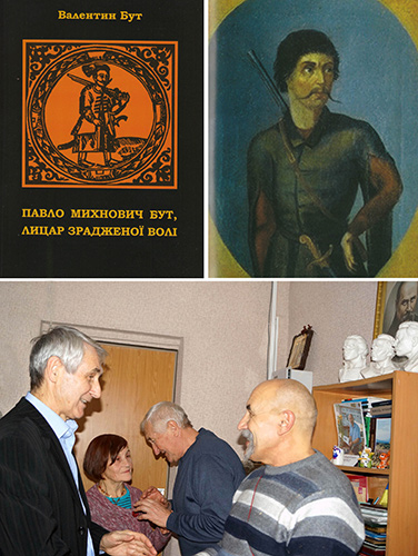 На фото: Валентин Бут (праворуч) ╕ В╕ктор Стус у «Св╕тлиц╕» на ╖╖ 25-р╕ччя, С╕мферополь, грудень 2017 р.; книга В. Бута та портрет його славного предка