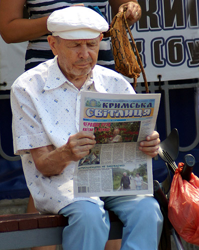 На фото: серпень 2014 року, м. С╕мферополь, ╤. Л. Лавтар з «Кримською св╕тлицею», яка тод╕ (через п╕вроку п╕сля анекс╕╖!) ще поширювалася в Криму (Фото В. Качули)