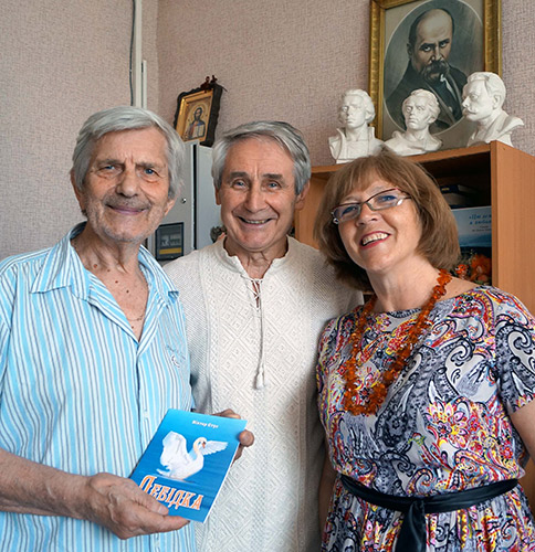 *** Прин╕с у дар пучечок васильк╕в. Та необачно взяв ╕ гороскопа. Виходить – не твоя я Пенелопа… Ех, жаль даремно втрачених рок╕в. 20.02.2018 *** На фото: кримськ╕ письменники Галина Литовченко, В╕ктор Стус ╕ Михайло Вишняк у «Кримськ╕й св╕тлиц╕», С╕мферополь, 2017 р.