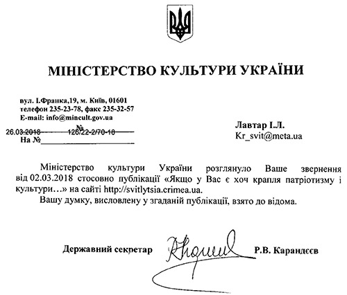 М╕н╕стру культури Укра╖ни Нищуку ╢. М. Коп╕╖: Президенту Укра╖ни Порошенку П. О. Голов╕ Верховно╖ Ради Укра╖ни Паруб╕ю А. В. Прем’╓р-м╕н╕стру Укра╖ни Гройсману В. Б. Текст звернення читайте за посиланням: http://svitlytsia.crimea.ua/index.php?section=article&artID=19733 *** Неймов╕рно, але к╕лька дн╕в тому з М╕н╕стерства культури на це звернення над╕йшла в╕дпов╕дь, п╕дписана колишн╕м заступником м╕н╕стра культури, а нин╕ держсекретарем Р. Каранд╓╓вим, за керування якого ще у 2015 роц╕ було припинено друк «Кримсько╖ св╕тлиц╕», а невдовз╕ був повн╕стю розгромлений ╖╖ кримський колектив. Вона перед вами (див. ╕люстрац╕ю) – дуже лакон╕чна, красномовна ╕ «надихаюча» – чи не так?