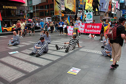 У Нью-Йорку в╕дбулася акц╕я на п╕дтримку укра╖нського режисера Олега Сенцова, який голоду╓ у рос╕йськ╕й в'язниц╕. Близько п╕всотн╕ учасник╕в акц╕╖ вийшли на Таймс-сквер з вимогою зв╕льнити Сенцова з ув'язнення. К╕лька учасник╕в акц╕╖ одяглися у тюремн╕ роби ╕ с╕ли посеред вулиц╕ з п╕сочним годинником у руках. "Час сплива╓ для Олега Сенцова через безстрокове голодування. Час сплива╓ для вс╕х пол╕тичних в'язн╕в. Час сплива╓ для тих, чи╖ права ╕ людська г╕дн╕сть принижен╕. Час сплива╓ для нашо╖ громадськост╕, якщо будемо ╕ дал╕ ╕гнорувати агрес╕ю Рос╕╖ проти Укра╖ни ╕ всього в╕льного св╕ту", - йдеться в заяв╕ актив╕ст╕в.