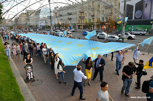 26 червня, у День кримськотатарського прапора, Хрещатиком пройшла хода з найб╕льшим у св╕т╕ кримськотатарським прапором (розм╕р полотнища — 39 на 6 метр╕в). В акц╕╖ взяли участь Голова Меджл╕су кримськотатарського народу Рефат Чубаров, члени Меджл╕су, а також сотн╕ киян ╕ гостей столиц╕. Як переда╓ коррепондент QHA, хода почалася б╕ля Бессарабського ринку. Учасники акц╕╖ рушили Хрещатиком до Майдану Незалежност╕ з гаслами "Крим — це Укра╖на". Тим часом, на Майдан╕ Незалежност╕ розпочався конкурс дитячого малюнка «М╕й Крим», присвячений Дню кримськотатарського прапора. Кримськотатарськ╕ та укра╖нськ╕ д╕ти малювали нац╕ональн╕ символи кримських татар, карту Укра╖ни з Кримом. У Ки╓в╕ також стартував автопроб╕г, присвячений Дню кримськотатарського прапора. Колона з 30-ти автомоб╕л╕в стартувала в╕д готелю "Космопол╕т" (метро "Шулявська"). Автомоб╕л╕ прикрашен╕ кримськотатарськими ╕ укра╖нськими прапорами. Ран╕ше QHA пов╕домляло, що 25 – 26 червня в анексованому Криму проводять марафон, присвячений Дню кримськотатарського прапора. Орган╕затором акц╕╖ виступив заступник голови Меджл╕су кримськотатарського народу Нар╕ман Джеляль, який разом з актив╕стами ма╓ нам╕р протягом двох дн╕в об╕йти увесь Крим з величезним кримськотатарським прапором. QHA