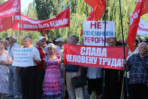 М╕тинг проти п╕двищення пенс╕йного в╕ку, запропонованого федеральним урядом, пройшов у Гагар╕нському парку С╕мферополя (на фото). На нього, за даними орган╕затор╕в – м╕сцевих комун╕ст╕в, прийшли близько 300 людей. «Буржуазний уряд <...> прагне, щоб ми з вами працювали до гробово╖ дошки, а пенс╕ю одержували б у загробному житт╕ в раю в╕д Бога. Влада рос╕йського кап╕тал╕зму сформувала корумповану парт╕ю, назва яко╖ «╢дина Рос╕я». Кер╕вництво ц╕╓╖ парт╕╖ роками веде планом╕рну пол╕тику геноциду рос╕йського народу на догоду невелик╕й купц╕ ол╕гархату», – сказав на акц╕╖ протесту депутат м╕ськради С╕мферополя, кер╕вник м╕ського ком╕тету КПРФ Степан К╕ск╕н. На м╕тингу була прийнята резолюц╕я, у як╕й ╓ вимоги про в╕дставку прем'╓р-м╕н╕стра РФ Дмитра Медвед╓ва як ╕н╕ц╕атора так звано╖ пенс╕йно╖ реформи, ╕ розпуску Державно╖ думи. Учасники заходи мають нам╕р направити звернення президентов╕ Рос╕╖ Володимиру Пут╕ну. Кр╕м того, була висловлена недов╕ра депутатам Держдуми в╕д Криму Руслану Бальбеку, Андр╕ю Козенку, Св╕тлан╕ Савченко, Михайлу Шеремету, Костянтину Бахар╓ву. Протестувальники також зажадали в╕д «глави Республ╕ки Крим» Серг╕я Аксьонова розпустити парламент республ╕ки, який схвалив п╕двищення пенс╕йного в╕ку. https://sevastopol.su/news