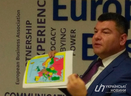 31 жовтня в оф╕с╕ European Business Assotiation (╢ВА) в╕дбувся круглий ст╕л Ком╕тету з лог╕стики Асоц╕ац╕╖, на якому виступив голова Державно╖ служби Укра╖ни з безпеки на транспорт╕ Ноняк Михайло. П╕д час виступу Ноняк показав карту ╢вропи з "рос╕йським" Кримом. Круглий ст╕л був присвячений обговоренню питання в╕дсутност╕ дозвол╕в на м╕жнародн╕ транспортн╕ перевезення, а також затримки перетину кордону на польському кордон╕. На карт╕, показан╕й п╕д час виступу голови Укртрансбезпеки, можна бачити, що Крим позначений таким же кольором, як ╕ Рос╕я - червоним. За даними джерела Укра╖нських Новин, н╕хто з присутн╕х у зал╕ не в╕дреагував на курйоз, що трапився. Як пов╕домляли Укра╖нськ╕ Новини, у Франц╕╖ продають глобуси з рос╕йським Кримом. Ран╕ше М╕н╕стерство культури Франц╕╖ показало карту з "рос╕йським" Севастополем.