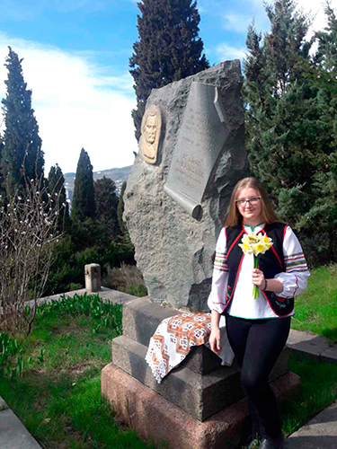 На фото: призерка цьогор╕чного л╕тературного конкурсу «Ми – д╕ти тво╖, Укра╖но!» ╕м. Д. Кононенка Л╕л╕я Привалова б╕ля пам'ятника С. Руданському в Ялт╕. ╥╖ конкурсна робота називалася «Стежками ялтинського поета ╕ л╕каря Степана Васильовича Руданського».