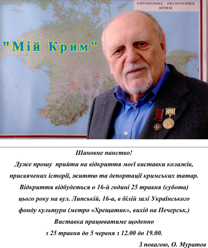 Не дивлячись на те, що на ц╕й виставц╕ будуть представлен╕ не т╕льки мо╖ роботи, а й роботи ╕нших кримськотатарських художник╕в, я назвав ╖╖ «М╤Й КРИМ». Чому? Бо роботи ╕нших художник╕в – це т╕, що мен╕ дуже подобаються ╕ сп╕впадають з мо╖м баченням Криму. З мо╖х роб╕т деяк╕ в╕дверто публ╕цистичн╕, а деяк╕ дуже ╕нтимн╕, присвячен╕ мо╖м родичам, як╕ спочатку жили в Карасубазар╕, а пот╕м жорстока доля розкидала ╖х по всьому св╕ту. ╢ й колаж╕, присвячен╕ ╕стор╕╖ мо╓╖ р╕дно╖ прабатьк╕вщини – славному Кримському ханству. У мене вже було багато персональних виставок р╕зного спрямування, як╕ пройшли досить усп╕шно. Однак я н╕як не м╕г об╕йти дуже болючу для мене тему – тему траг╕чно╖ дол╕ кримських татар. Спод╕ваюся, людям буде ц╕каво ознайомитися з ц╕╓ю експозиц╕╓ю. В усякому раз╕ вона дуже щира. З повагою Олександр Муратов – к╕норежисер, письменник, художник, журнал╕ст *** Не так давно у "Св╕тлиц╕" публ╕кувалися пов╕сть О. Муратова "Татарська кров" ╕ його публ╕цистичн╕ роздуми. Ось посилання: http://svitlytsia.crimea.ua/index.php?section=article&artID=14652 http://svitlytsia.crimea.ua/index.php?section=article&artID=13025