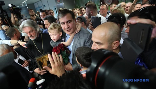 Л╕так ╕з Саакашв╕л╕ у середу приземлився в аеропорту “Борисп╕ль”, пов╕домля╓ кореспондент Укр╕нформу. На прил╕т Саакашв╕л╕ оч╕кували близько двох сотень його прихильник╕в. Вони зустр╕ли Саакашв╕л╕ оплесками, рад╕сними вигуками ╕ криками "М╕ша, М╕ша". На м╕сц╕ зустр╕ч╕ присутн╕ також понад два десятк╕в журнал╕ст╕в. На автостоянц╕ неподал╕к аеропорту стоять к╕лька автомоб╕л╕в ╕з прапорами "Руху нових". Деяк╕ з прихильник╕в Саакашв╕л╕, як╕ оч╕кували на його прил╕т, тримають у руках прапори Укра╖ни та прапори "Руху нових сил". Прихильники Саакашв╕л╕ перед його виходом до них ╕ журнал╕ст╕в також сп╕вали Г╕мн Укра╖ни ╕ скандували "Слава Укра╖н╕ - Героям слава". Серед тих, хто зустр╕чав Саакашв╕л╕, - Герой Укра╖ни Степан Хмара, а також один ╕з соратник╕в Саакашв╕л╕ Давид Сакварел╕дзе. Як пов╕домляв Укр╕нформ, Президент Володимир Зеленський указом № 329/2019 повернув громадянство Укра╖ни екс-президенту Груз╕╖ та колишньому голов╕ Одесько╖ ОДА М╕хе╖лу Саакашв╕л╕ шляхом внесення зм╕н до указу екс-президента Петра Порошенка. Укра╖нський паспорт Саакашв╕л╕ отримав у 2015 роц╕. Тод╕ в╕н був призначений на посаду голови Одесько╖ обласно╖ державно╖ адм╕н╕страц╕╖. Восени 2016 року п╕шов у в╕дставку, а вже 26 липня 2017 року президент Порошенко позбавив Саакашв╕л╕ укра╖нського громадянства.