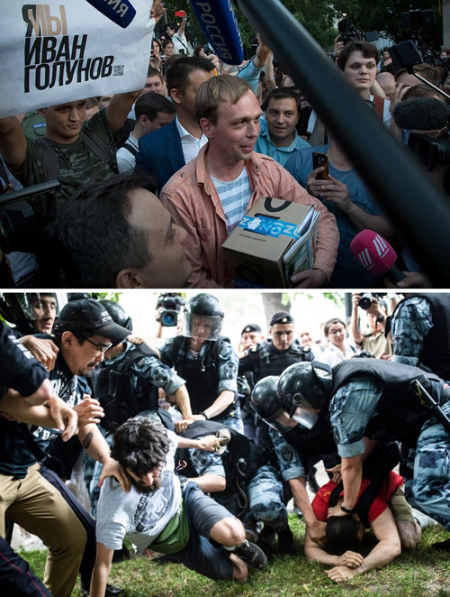 У середу в Москв╕ проходив марш на п╕дтримку журнал╕ста онлайнового ресурсу "Медуза" ╤вана Голунова, затриманого к╕лька дн╕в тому п╕сля того, як у нього н╕бито знайшли наркотики. Треба сказати, що оск╕льки акц╕я не була узгоджена з владою, саме видання «Медуза» закликало актив╕ст╕в утриматися в╕д участ╕, тим б╕льше, що влада дала «задн╕й х╕д», справу проти Голунова закрили ╕ дехто в Рос╕╖ розц╕нив це ледве не як перемогу «демократ╕╖ над режимом». ╤ван Голунов теж закликав не ризикувати. Проте к╕лька тисяч людей все одно на протест вийшли. Ну, а дал╕ - все п╕шло за звичним сценар╕╓м. На середину дня пол╕ц╕я та Росгвард╕я затримали близько 400 ос╕б, пов╕домля╓ "ОВД-Инфо". Затримували, зокрема, за футболки «Я/Мы Голунов». В автозаки кидали тих, хто прийшов з плакатами, ╕ тих, хто намага╓ться зн╕мати те, що в╕дбува╓ться - в тому числ╕ ╕ журнал╕ст╕в з посв╕дченнями. Серед затриманих пол╕толог Катерина Шульман, засновник Фонду боротьби з корупц╕╓ю Олекс╕й Навальний, прац╕вники Reuters, «Дождя», Der Spiegel, Le Temps. Так от «перемога демократ╕╖»… Пут╕нський режим в╕дпов╕в просто: «Вы хоть нас и победили, но… Упал-отжался! Лежать-бояться!». Ш╕сть дн╕в, як╕ минули з початку скандалу, дали чимало ╕нформац╕╖ про стан справ у тамтешн╕й влад╕ та сусп╕льств╕. Спроба усунути журнал╕ста-розсл╕дувача ╤вана Голунова шляхом пол╕цейсько╖ провокац╕╖ обернулася проти влади, дала громадянам можлив╕сть в╕дчути силу сол╕дарност╕, а також побачити ясно злочини, про як╕ вс╕ знали ╕ саме тому вони вважалися «звичайними». Нагада╓мо, що сталося, для тих, хто пропустив Спершу «н╕чого особливого» - 6 червня московськ╕ пол╕цейськ╕ п╕дкинули наркотики замовлен╕й жертв╕, пот╕м ще п╕вдня пройшли «як зазвичай»: били, не давали зв'язатися з близькими ╕ адвокатом, в╕дмовляли в обов’язкових у таких випадках експертизах. Але пот╕м «щось п╕шло не так»: з’ясувалося, що фотограф╕╖ буц╕мто з м╕сця злочину, дарма, що розм╕щен╕ на сайт╕ аж самого МВС (!) – а все одно фейков╕, а анал╕зи затриманого – чист╕ в╕д наркоти, а сам затриманий – журнал╕ст видання «Медуза» ╤ван Голунов - в╕дмовля╓ться приймати ╖жу в С╤ЗО, щоб не п╕дсипали наркотик╕в «для експертизи». Два дн╕ б╕ля буд╕вл╕ ГУВС Москви тривали п╕кети на п╕дтримку журнал╕ста, в них взяли участь сотн╕ москвич╕в. Акц╕╖ пройшли також в Санкт-Петербурз╕ та ╕нших м╕стах. ╤нтернет рясн╕в заявами в╕домих людей. Петиц╕я журнал╕ст╕в швидко набрала 2500 п╕дпис╕в. За згадками в ╕нтернет╕ Голунов випередив нав╕ть Пут╕на… ╤ вже ввечер╕ 8 червня сталося небачене: одна голова дракона в╕дмовила ╕нш╕й, прост╕ше кажучи, московський суд в╕дмовив московськ╕й же пол╕ц╕╖ ╕ в╕дправив спецкора «Медузи» не в С╤ЗО, а п╕д домашн╕й арешт – хай з найсувор╕шими умовами, але ж вирвався з щелеп. Ще за два дн╕ м╕н╕стр МВС Рос╕╖ пов╕домив, що з журнал╕ста знят╕ обвинувачення: «За результатами проведення б╕олог╕чних, крим╕нал╕стичних, дактилоскоп╕чних ╕ генетичних експертиз прийнято р╕шення про припинення крим╕нального пересл╕дування громадянина ╤вана Голунова у зв'язку з недоведен╕стю його участ╕ у ско╓нн╕ злочину». Натом╕сть в╕дсторонили пол╕цейських, як╕ його «пакували», та об╕цяно усунути з посад двох пол╕цейських генерал╕в – думайте сам╕: чи то за злочин проти 