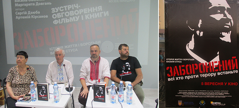 8 вересня в ╤нформац╕йно-виставковому центр╕ Музею Майдану в Ки╓в╕ в╕дбулася зустр╕ч з однодумцями Василя Стуса та сценаристами ф╕льму «Заборонений». Ф╕льм присвячений протистоянню купки укра╖нських ╕нтел╕гент╕в русиф╕каторськ╕й репресивн╕й машин╕ комун╕стичного режиму, який не гребував крим╕нальними злочинами. В основу ф╕льму «Заборонений» (режисер Роман Бровко) покладено житт╓пис поета-дисидента Василя Стуса. Спогадами про Стуса под╕лилась особисто з ним знайома Маргарита Довгань, дружина скульптора Бориса Довганя. Автори сценар╕ю ф╕льму «Заборонений» ╕ однойменно╖ книги Серг╕й Дзюба ╕ Артем╕й К╕рсанов розпов╕ли про свою роботу. Вони використали матер╕али порталу, який створив син героя Дмитро Стус, сп╕лкувалися з Левком Лук’яненком, ╤ваном Драчем, Борисом Довганем, Миколою Жулинським та ╕ншими. Виступив колишн╕й пол╕тв’язень Василь Овс╕╓нко, який деякий час понев╕рявся в ув’язненн╕ разом ╕з Василем Стусом. Йому вдалося вивезти частину в╕рш╕в Стуса ╕з мордовського табору. Але багато в╕рш╕в Василя Стуса, написаних у м╕сцях позбавлення вол╕, втрачено. Овс╕╓нко висловив зауваження до ф╕льму. У табор╕ вони ╕з Стусом були одягнут╕ в смугастий одяг, як небезпечн╕ злочинц╕, а не в чорний, як у ф╕льм╕. У карцер╕ не було подушки. В’язень м╕г покласти п╕д голову х╕ба що капц╕. Сценарист Серг╕й Дзюба зазначив, що ф╕льм «Заборонений» - художн╕й, а не документальний. Наприклад, самоспалення Василя Макуха в Ки╓в╕, на Хрещатику, на знак протесту проти радянсько╖ окупац╕╖ Чехословаччини ╕ зрос╕йщення Укра╖ни, Стус не бачив. Але в ф╕льм╕ в╕н випадково ста╓ св╕дком ц╕╓╖ трагед╕╖. Дзюба сказав, що його 12-л╕тн╕й син, прочитавши книгу «Заборонений», п╕шов подивитися ф╕льм. Загалом, книжка ╕ ф╕льм не лише про Стуса, але й про заборону укра╖нсько╖ мови, про людей, як╕ були навколо Стуса. В сцен╕ засудження Стуса його адвокат говорить, що п╕дзахисний винен, хоча сам Василь Семенович себе винним не визнав. А це порушення адвокатсько╖ етики. Стус намагався в╕дмовитися в╕д такого адвоката, але суд в╕дхилив його вимогу. В╕домо, що цим адвокатом був нин╕шн╕й пол╕тичний д╕яч В╕ктор Медведчук. Проте в ф╕льм╕ його ╕м’я не названо. Сценарист Артем╕й К╕рсанов пояснив, що в художньому ф╕льм╕ можна вказувати ╕м’я т╕льки з дозволу дано╖ особи, або його родич╕в. Так, син Василя Стуса Дмитро Стус погодився на ф╕льм про його батька. Дозв╕л на використання ╕мен╕ художниц╕ Алли Горсько╖ дали ╖╖ родич╕. В╕ктор Медведчук такого дозволу не давав. Тому, якби в ф╕льм╕ прозвучало ╕м’я Медведчука, то глядач╕ стр╕чки б не побачили. Вс╕ в╕дзначають талановиту гру виконавця головно╖ рол╕ актора Дмитра Ярошенка, який нав╕ть зовн╕ схожий на Василя Стуса. Роксоляна Хмара ╕з Рогатина в╕д ╕мен╕ глядач╕в висловила величезне захоплення ф╕льмом «Заборонений». Анатол╕й Зборовський