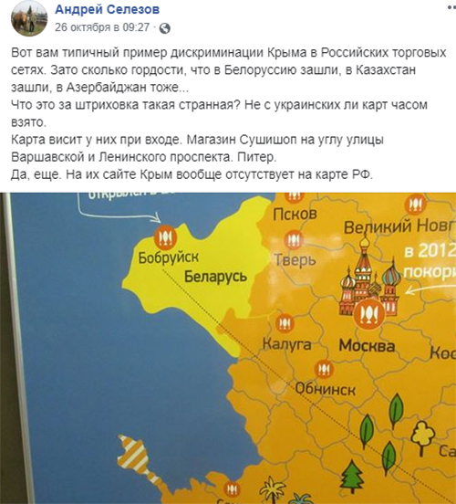 "Ось вам типовий приклад дискрим╕нац╕╖ Криму в рос╕йських торгових мережах. Зате ск╕льки гордост╕, що в Б╕лорусь зайшли, в Казахстан зайшли, в Азербайджан теж... Що це за штрихування таке дивне? Чи не з укра╖нських карт взято. Карта висить у них при вход╕. Магазин Сушишоп на роз╕ вулиц╕ Варшавсько╖ ╕ Лен╕нського проспекту. П╕тер. Окр╕м цього, на ╖х сайт╕ Крим взагал╕ в╕дсутн╕й на карт╕ РФ", – написав Селезньов у коментар╕ до фото.