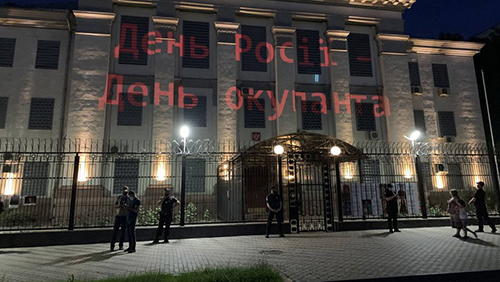 П╕зно ввечер╕ 12 червня, у День Рос╕╖, п╕д посольством Рос╕йсько╖ Федерац╕╖ у Ки╓в╕ в╕дбулася акц╕я "День Рос╕╖ – день окупанта". Про це пов╕домля╓ Сусп╕льне. Акц╕я розпочалася приблизно о 21:30 та тривала годину. Орган╕заторами виступили ГО "Корпус справедливост╕" та Кримськотатарський ресурсний центр. В акц╕╖ взяли участь близько 50 людей з прапорами кримських татар та УПА. П╕д час заходу в╕дбувалася трансляц╕я з про╓ктора в╕део з написами, що Рос╕я ╓ кра╖ною окупантом. Учасники акц╕╖ запалили лампадки на честь жертв Кремля. Як пов╕домляв Укр╕нформ, напередодн╕ Дня Рос╕╖ б╕ля рос╕йських дипустанов у Ки╓в╕, Львов╕ та Одес╕ встановили тематичн╕ б╕лборди з емблемами контррозв╕дки СБУ, а в Харков╕ поруч ╕з консульством РФ створили мурал.