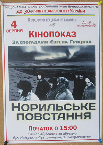 Нац╕ональна б╕бл╕отека Укра╖ни ╕мен╕ Ярослава Мудрого в Ки╓в╕ проводить назустр╕ч 30-р╕ччю Незалежност╕ Укра╖ни сер╕ю к╕нопоказ╕в. 4 серпня було продемонстровано ф╕льм «Норильське повстання» (режисер ╤гор Висневський, сценаристка Олена Моренцова-Шулик). Ф╕льм створено у 2019 роц╕. Це к╕норозпов╕дь про одного з кер╕вник╕в Норильського повстання ╢вгена Грицяка, якому 9 серпня виповнилося б 95 рок╕в. У к╕ноф╕льм╕ ╢вген Грицяк зустр╕ча╓ться ╕з американським журнал╕стом ╕ розпов╕да╓ йому про Норильське повстання. Наприк╕нц╕ ф╕льму з’являються агенти КДБ ╕ заарештовують Грицяка. ╢вген Грицяк народився на Зах╕дн╕й Укра╖н╕, п╕д час Друго╖ св╕тово╖ в╕йни вступив до молод╕жно╖ мереж╕ ОУН, щоб боротися з н╕мецькими окупантами. У 1944 роц╕ його моб╕л╕зували до радянсько╖ арм╕╖. Юнак воював хоробро, був нагороджений медалями «За в╕двагу» ╕ «За перемогу над Н╕меччиною у Друг╕й св╕тов╕й в╕йн╕ 1941-1945 рр.» А в 1949 роц╕ його заарештували ╕ засудили до розстр╕лу за членство в ОУН. Смертний вирок зам╕нили 25-ма роками ув’язнення. Покарання в╕дбував у р╕зних радянських концтаборах. П╕сля смерт╕ Стал╕на в’язн╕ спод╕валися на пом’якшення режиму. Але розстр╕ли ╕ сваволя адм╕н╕страц╕╖ продовжувалися. Прибуття в табори ГУЛАГу учасник╕в ОУН ╕ УПА зм╕нило тут ситуац╕ю. Укра╖нськ╕ пол╕тв’язн╕ розправилися з крим╕нальними злочинцями, як╕ збиткувалися над ними. То одного, то ╕ншого крим╕нальника знаходили мертвим. Нарешт╕ спалахнуло повстання в Норильську, яке тривало 61 день – ╕з 24 травня по 4 серпня 1953 року. В’язн╕ оголосили страйк, вимагаючи прислати до них ком╕с╕ю ╕з Москви ╕ припинити свав╕льн╕ розправи. Це було найперше ╕ наймасов╕ше повстання п╕сля смерт╕ Стал╕на. Воно започаткувало демонтаж людоненависницько╖ системи ГУЛАГу. ╢вген Грицяк в ув’язненн╕ вивчив англ╕йську мову хатха-йогу. Завдяки вправам з хатха-йоги в╕н вижив в увязненн╕, коли нав╕ть л╕кар╕ зробили висновок, що Грицяк не виживе. У 1956 роц╕ ╢вгена Грицяка зв╕льнили, а в 1964 заарештували знову за сфальсиф╕кованими звинуваченнями. У 1964 роц╕ ╢вген Грицяк вийшов на волю. В╕н одружився з учителькою. У подружжя Грицяк╕в народилася донька, яка стала вчителькою. Лише у 2009 роц╕, п╕сля публ╕кац╕╖ про долю ╢вгена Грицяка в газет╕ «День», його було нагороджено орденом «За в╕двагу». У 1980 роц╕ закордонне видавництво «Смолоскип» видало книгу Грицяка «Короткий запис спогад╕в. ╤стор╕я Норильського повстання». Грицяк зазнав пересл╕дувань КДБ. Ще жив╕ учасники повстання дор╕кали ╢вгену Грицяку, що в╕н назвав мало ╕мен повстанц╕в. ╢вген Грицяк пояснював, що в╕н не хот╕в, щоб ╖х знову пересл╕дували. Коли Укра╖на проголосила незалежн╕сть, Грицяк по пам’ят╕ в╕дтворив ╕мена п╕втисяч╕ учасник╕в Норильського повстання. Глядач╕ показу ф╕льму в б╕бл╕отец╕ висловили побажання, щоб «Норильське повстання» продемонстрували на телеканалах. Анатол╕й Зборовський
