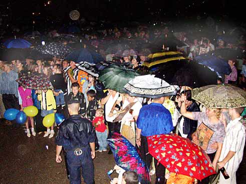 Хоч в афішах і значилося, що відбувається це свято, яке до того ж відкривало Дні української культури в районі, під патронатом одного з "найресурсніших" кандидатів у Президенти, цього не вистачило, щоб розігнати над Красногвардійським несвяткові хмари. Чи то й справді 13-та річниця мала бути саме такою, чи Всевишньому не сподобалося, що хтось перебирає у нього патронат над тим, що діється на грішній землі (а може, красногвардійці видрукували на афішах прізвище небогоугодного патрона?), але небеса внесли у святковий сценарій свої корективи. Дощ довго не давав розпочати свята, потім не раз втручався у його сюжет, але до честі і організаторів, і артистів, і глядачів - свято таки відбулося! За словами першого заступника голови райдержадміністрації Красногвардійського району Володимира Паштецького, всього у святкових заходах того дня взяли участь майже п'ять тисяч чоловік. Для сільського райцентру - це немало. До того ж, програма, яку підготували для присутніх організатори на чолі з самим паном Володимиром, могла б прикрасити навіть столичне свято.