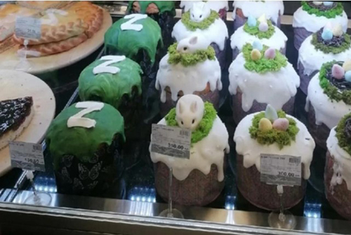У мереж╕ з'явилися фото пасок ╕з зображенням буквою "Z", як╕ стояли на одн╕й в╕трин╕ з традиц╕йними пасками. Такий хл╕бобулочний вир╕б коштував 190 рубл╕в, а це близько 70 гривень.