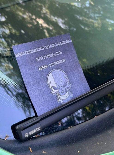 "В╕йськовослужбовець Рос╕йсько╖ Федерац╕╖, знай: ми вже тут. Крим - це Укра╖на", - написано на наклейц╕, залишен╕й на машин╕ в окупован╕й ╢впатор╕╖.