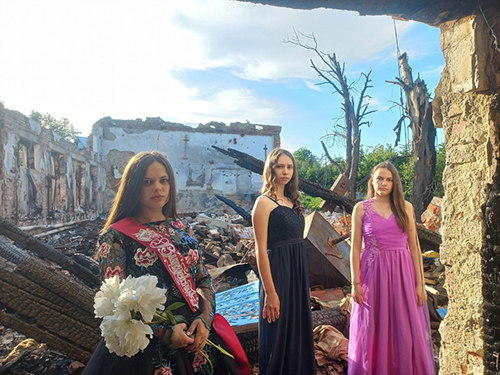 Так з’явилися випускн╕ фотоальбоми на тл╕ руйнувань. Прощальн╕ шк╕льн╕ вальси станцювали на тл╕ знищених шк╕л, пишн╕ сукн╕, як╕ купували на випускн╕ вечори, довелося вдягнути на ру╖ни, зам╕сть святкувань влаштували флешмоби.