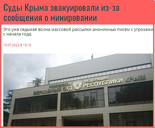 Останн╕м днями, принаймн╕ в деяких м╕стах Криму, знову взялися за в╕дпрацювання "м╕нно╖ загрози": пол╕ц╕я блоку╓ квартал з "зам╕нованим" об'╓ктом, зазвичай якимось адм╕н╕стративним закладом на кшталт м╕сцево╖ адм╕н╕страц╕╖, навчального закладу чи суду, евакую╓ персонал ╕ спецп╕дрозд╕л МНС (чи в╕йськових сапер╕в?) перев╕ря╓ буд╕влю (а чи просто ╕м╕ту╓ розм╕нування?). Власне, таке вже було ╕ на початку лютого минулого року, ╕ в перш╕й декад╕ червня цьогор╕ч.