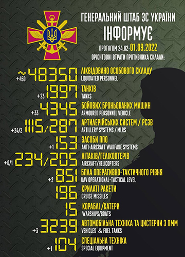 Генштаб: оперативна ╕нформац╕я на 18:00 1 вересня 2022 р.