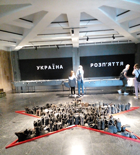 В одному ╕з прим╕щень Нац╕онального музе╖ ╕стор╕╖ Укра╖ни у Друг╕й св╕тов╕й в╕йн╕ експону╓ться виставка «Укра╖на. Розп’яття». Представлено експонати, з╕бран╕ прац╕вниками музею на територ╕╖ Ки╖вщини ╕ Черн╕г╕вщини. Серед них документи, зброя та ╕нш╕ реч╕ рос╕йських загарбник╕в, зокрема робоча карта диверс╕йно-розв╕дувально╖ групи, яка мала оперувати на л╕вобережн╕й частин╕ Ки╓ва. Експонуються реч╕ цив╕льних жител╕в Укра╖ни, чи╖ дом╕вки зруйнован╕ рос╕йськими снарядами, пам’ятки, як╕ вдалося врятувати з╕ спаленого ╤ванк╕вського ╕сторико-кра╓знавчого музею. Рос╕йська пропаганда силку╓ться зобразити сво╖х окупант╕в продовжувачами во╖н╕в Друго╖ св╕тово╖ в╕йни, як╕ виганяли н╕мецьких окупант╕в. Але вони ╓ спадко╓мцями н╕мецьких нацист╕в. Про це св╕дчать пошкоджен╕ погруддя Геро╖в Радянського Союзу Н╕ни Сосн╕но╖ ╕ Якова Толочина ╕з селища ╤ванкова, розбит╕ мемор╕альн╕ плити ╕з братсько╖ могили во╖н╕в Друго╖ св╕тово╖ в╕йни в селищ╕ Гостомель. На виставц╕ в╕дтворено укриття, де переховувались жител╕ Гостомеля. Кожний експонат ма╓ свою ╕стор╕ю. Наприклад, картина «Тарас». ╥╖ автор 17-р╕чний художник ╢вген Гальона через в╕йну мусив ╕з родиною евакуюватися до Н╕меччини. Нин╕ в╕н прожива╓ в Гамбурз╕, де працю╓ над сер╕╓ю картин, присвячених боротьб╕ народу Укра╖ни проти рос╕йсько╖ агрес╕╖. Ус╕ кошти, виручен╕ в╕д продажу твор╕в, переда╓ до благод╕йних фонд╕в. Портрет Тараса Шевченка було продано на аукц╕он╕ за 500 ╓вро. Цю суму передано Благод╕йному фонду «Скрижал╕» для придбання тактичних аптечок.