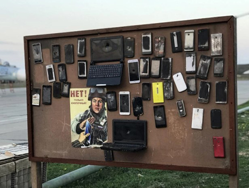 Найц╕кав╕ше, що поруч з╕ смартфонами ╕ ноутбуками висить плакат в радянському стил╕. На ньому рос╕йський солдат в╕дмовля╓ться в╕д сенсорного телефону, а зверху написано: "Н╕! Т╕льки кнопковий". Однак на стенд╕ присутн╕й ╕ такий гаджет. Мабуть, творц╕ "апл╕кац╕╖" не особливо замислювалися, що вони прибивають цвяхами до дошки.