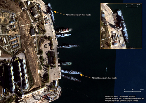 Супутник заф╕ксував корабель класу «Адмирал Григорович» у в╕дкритому мор╕ на буксир╕. За п'ять годин цей корабель опинився б╕ля швартово╖ ст╕нки Стр╕лецько╖ бухти в Севастопол╕.