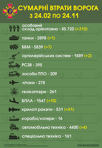 Ми з╕брали для вас ╕нформац╕ю про дв╕ст╕ с╕мдесят четвертий день в╕йни: чим жили Укра╖на та укра╖нц╕ 24 листопада 2022 року.