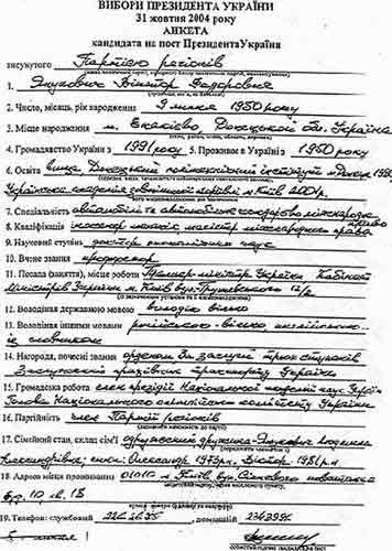 Як відомо, у чиновників є дві вади - хабарництво й безграмотність. Щодо останнього, то окремі екземпляри - просто "взірці". Навіть найвищі. За час своєї президентської кампанії Віктор Янукович зробив дві відомі речі - підняв мінімальні пенсії і змінив назву своєї посади на "прємьєр-міністр". Тоді політично просунутий люд два тижні не міг заспокоїтися, що прем'єр робить по дві помилки в одному слові. Як виявилось, це була лише вершина айсберга. "Українська правда" отримала ксерокопію "Анкети кандидата на пост Президента" Віктора Януковича, заповненої ним власноруч і поданої до Центрвиборчкому. Звичайно, "людині властиво помилятися". Але щоб настільки?! Перші три рядки анкети кандидат заповнив правильно. Він знає, що висунутий Партією регіонів, що звуть його Янукович Віктор Федорович, що народився він 9 липня. А далі починається "формєнний бєспрєдєл". Місце свого народження Янукович визначив як "м. Енакієво, Донецькой обл. Україна". Орфографічний словник української мови С.І.Головащука, М.М.Пещак 1994 року на 214 сторінці засвідчує, що слово "Енакієво" пишеться як Єнакієве. Знову дві помилки в одному слові. Далі - прикметник "донецький" у родовому відмінку жіночого роду має закінчення -ої, а не -ой. А сама фраза мала б писатися або як "м. Єнакієве, Донецька обл., Україна", або як "м. Єнакієве, Донецької обл. України". І це при тому, що освіта кандидата, як свідчить анкета, вища - Донецький політехнічний інстітут (саме так, а не нормативне "інститут"), який він закінчив 1980 року в місті "Донецк". Можливо, Янукович і поставив у назві міста м'який знак, але дуже вже дрібний, неозброєним оком не видно. А ще Янукович учився в Українській академії зовнішньої торгівлі. Саме там він, напевно, й отримав науковий ступінь - "доктор экономічних наук". Взагалі-то літери "э" в українській мові немає. Але, напевно, академіку трьох академій видніше. ТОМУ ЩО "ПРОФФЕСОР". Саме так написав своє вчене звання Янукович - "проффесор". Про всяк випадок нагадаємо норму з параграфу 89 "Україн-ського правопису": "у загальних назвах іншомовного походження приголосні, звичайно, не подвоюються". Якщо, звісно, Віктор Федорович не відносить вчене звання до географічних назв. Зауважимо, що "професор" і в англійській, і в німецькій так само пишеться з однією "ф". Пункт одинадцятий (місце роботи) виглядає вже звично - "прємьєр-міністр". Єдина радість - він знає, що в словосполученні Кабінет Міністрів України всі три слова пишуться з великої літери. А от в написанні решти своїх посад Янукович знову помилився, зазначивши, що є членом "презідії" Національної академії наук України, головою Національного "олімпійсьго" комітету та нагороджений орденом "За заслуги" "трьох ступенів". Окрім цього, Янукович помилився в написанні по-батькові власної дружини, написавши її, як Александрівну. Що дивно, ім'я старшого сина написано правильно - Олександр. У тексті з 90 слів кандидат в Президенти зробив 12 грубих помилок. Це при тому, що, як написано в анкеті, українською мовою він володіє вільно. От англійською, то "із словником". Не грубо, але краще писати "зі словником". ТОМУ ЩО милозвучніше.