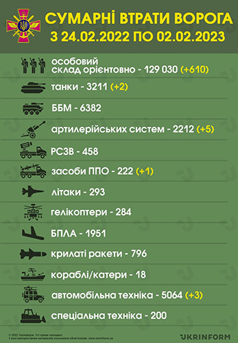 Ми з╕брали для вас ╕нформац╕ю про триста сорок четвертий день Велико╖ в╕йни: чим жили Укра╖на та укра╖нц╕ 2 лютого 2023 року.