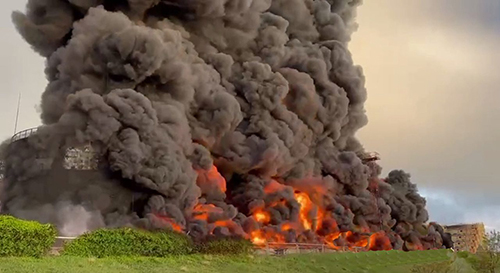 В н╕ч на 4 травня, о 2:05, було завдано удару чотирма безп╕лотниками по ╤льському НПЗ, що на Кубан╕. Площа пожеж╕ складала до 400 кв. м.
