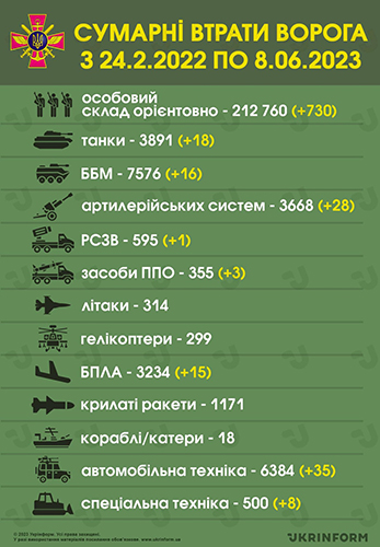 Ми з╕брали для вас ╕нформац╕ю про чотириста с╕мдесятий день Велико╖ в╕йни: чим жили Укра╖на та укра╖нц╕ 8 червня 2023 року.