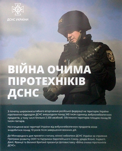 З нагоди М╕жнародного дня просв╕ти з питань м╕нно╖ небезпеки Державна служба з надзвичайних ситуац╕й Укра╖ни за сприяння Програми розвитку ООН ╕ п╕дтримки ╢вропейського Союзу, уряд╕в Япон╕╖, Хорват╕╖, Дан╕╖, Франц╕╖ та Велико╖ Британ╕╖ експонувала в Мистецькому Арсенал╕ в Ки╓в╕ фотовиставку «В╕йна очима п╕ротехн╕к╕в ДСНС».