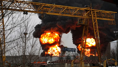 Пожежу не могли загасити понад 8 годин, пов╕домлялося, що вогонь охопив 200 квадратних метр╕в площ╕. У момент удару на завод╕ було 100 тонн бензину та 200 тонн мазуту.