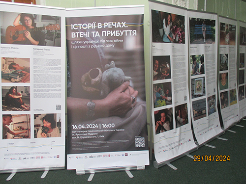 В Нац╕ональн╕й б╕бл╕отец╕ Укра╖ни ╕м. Ярослава Мудрого в Ки╓в╕ експону╓ться виставка на банерах “╤стор╕я в речах. Втеч╕ та прибуття”. Це фото ╕ тексти монолог╕в двадцяти укра╖нських ж╕нок, як╕ мусили залишити дом╕вку на Донеччин╕, Херсонщин╕, в Криму, Луганську, Запор╕жж╕ та Запор╕зьк╕й област╕ ╕ т╕кати в╕д рос╕йських окупант╕в у Льв╕в ╕ Черн╕вц╕. Передус╕м мусили т╕кати т╕, хто брав участь у Майдан╕ ╕ т╕, в кого р╕дн╕ брали участь в АТО.