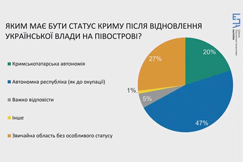 «47% укра╖нц╕в вважають, що Крим п╕сля деокупац╕╖ повинен мати автоном╕ю, як це було до 2014 року, 20% – кримськотатарську автоном╕ю, 27% – вважають, що це ма╓ бути звичайна область без особливого статусу, 5% – важко в╕дпов╕сти, 1% – ╕нше», – сказав Суслов.