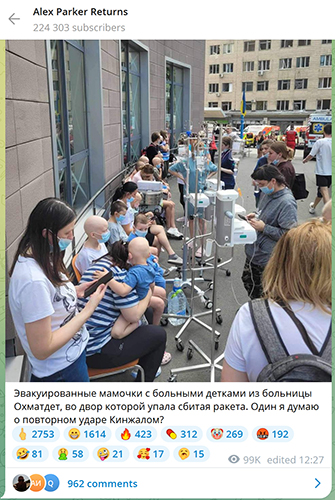 Вт╕м, така терористична «миротворч╕сть» Кремля ╕ спроби в╕дхреститись в╕д чергового во╓нного злочину сус╕дить з геноцидальною пропагандою. Наприклад, ось як в╕дреагував на удар по «Охматдиту» рос╕йський пропагандистський телеграм-канал Alex Parker Returns з аудитор╕╓ю понад 224 тисяч╕ ос╕б: «Евакуйован╕ матус╕ з хворими д╕тками з л╕карн╕ Охматдит, на подв╕р’я котро╖ впала збита ракета. Лише я думаю про повторний удар Кинджалом?».