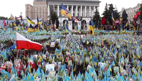 ╤ так, наш╕ Майдани надал╕ йшли кр╕зь новий р╕к. ╤ так, ялинки 2004 року пот╕м переросли у знамениту йолку 2013 року – недобудовану п╕рам╕ду час╕в Януковича. Тепер зам╕сть ялинок – прапорц╕ пам’ят╕ на газонах. Це теж наше укра╖нське, ╕мпров╕зоване р╕шення – так не забути, пам’ятати, не простити за кожного ╕ кожну, полеглих у ц╕й в╕йн╕. Ти сто╖ш, ми теж, ╕ ц╕ прапори...