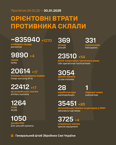 Ми з╕брали для вас ╕нформац╕ю про тисяча с╕мдесят другий день Велико╖ в╕йни: чим жили Укра╖на та укра╖нц╕ 30 с╕чня 2025 року.