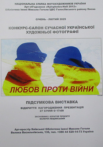 27 с╕чня в арт-простор╕ Ки╖всько╖ б╕бл╕отеки ╕мен╕ Миколи Гоголя в╕дбулося в╕дкриття фотовиставки «Любов проти в╕йни». Тему любов╕ взято в широкому значенн╕ цього слова. На одному фото мама трима╓ на руках дитину, а навколо розкидан╕ уламки. Очевидно, т╕льки що стався «прил╕т». На вулиц╕ ц╕луються неюн╕ чолов╕к ╕ ж╕нка. Але вони в камуфляжах. ╥хня розлука могла стати та й ще може стати в╕чною. Адже в╕йна трива╓. Во╖н з д╕вчиною фотографуються на тл╕ п╕дбито╖ рос╕йсько╖ техн╕ки. Во╖ни гр╕ються б╕ля багаття. Крупним планом рука в камуфляжному рукав╕ потиска╓ лапу, дов╕рливо простягнуту собакою.