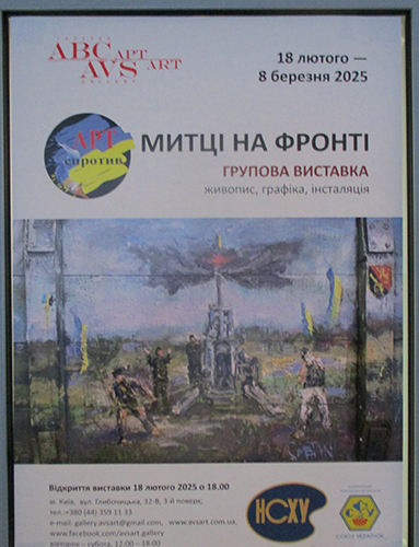 18 лютого в Ки╓в╕, в художн╕й галере╖ “АВС-арт” в╕дкрилася виставка “Артспротив: митц╕ на фронт╕”. Представлено живопис, граф╕ку та ╕нсталяц╕╖ р╕зних художник╕в, що нараз╕ захищають Укра╖ну в╕д рос╕йських окупант╕в. Вони представляють майже всю Укра╖ну. Серг╕й Герасименко, Володимир Гур╕н, В╕ктор Соловар ╕ Артем Шевченко — кияни. Серг╕й Бурбело з м╕ста Дн╕про. В╕н малю╓ кра╓види Криму, цитуючи на полотн╕ кримськотатарськ╕ народн╕ п╕сн╕ мовою ориг╕налу. Володимир Вакуленко народився в Знам’янц╕ на Черкащин╕. Роман Кравчук народився в сел╕ Русил╕в Бучацького району на Терноп╕льщин╕. В╕н очолив Черкаську обласну орган╕зац╕ю Нац╕онально╖ сп╕лки художник╕в Укра╖ни. Священник, художник, ╕конописець, блогер ╕ капелан Микола Мединський народився в сел╕ Середн╕й Берез╕в Кос╕вського району ╤вано-Франк╕всько╖ област╕. В╕н працю╓ капеланом Генерального штабу ЗСУ на найгаряч╕ших д╕лянках фронту в склад╕ штурмового полку “Сафар╕”. Серг╕й Сметанк╕н ╕з Слов’янська Донецько╖ област╕. ╤гор Талалай ╕з Черн╕вц╕в. Василь Теличко-Еверт ╕з Мак╕╖вки Донецько╖ област╕.