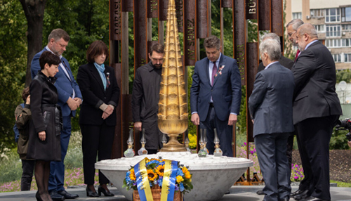 В╕д ╕мен╕ Президента Володимира Зеленського в╕дбулося покладання кошика з кв╕тами до мемор╕алу пам’ят╕ жертв геноциду кримського народу. Учасники заходу вшанували пам’ять загиблих, запаливши гасов╕ лампи ╕ поклавши кв╕ти.