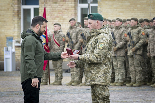 З нагоди Дня захисник╕в ╕ захисниць Укра╖ни Президент Володимир Зеленський в╕дзначив во╖н╕в державними нагородами, вручив командирам бригад бойов╕ прапори, стр╕чки почесно╖ в╕дзнаки «За мужн╕сть та в╕двагу» й стр╕чки почесних найменувань. У присутност╕ Глави держави курсанти в╕йськових л╕це╖в склали клятву л╕це╖ст╕в.