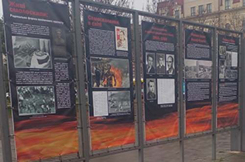 На Контрактов╕й площ╕ в Ки╓в╕ експону╓ться банерна виставка "Жив╕ смолоскипи: радикальн╕ форми пол╕тичного протесту". Вона розпов╕да╓ про людей, як╕ наважилися на самоспалення, щоб привернути увагу громадськост╕ до тих чи ╕нших проблем проти яких вони протестували. Найчаст╕ше так╕ вчинки в╕дбувались в аз╕йських кра╖нах. Упродовж 1963-2002 рок╕в найб╕льше випадк╕в було заф╕ксовано в ╤нд╕╖ (255), П╕вденному В'╓тнам╕ (92), та П╕вденн╕й Коре╖ (43). Останн╕ми десятил╕ттями зросла к╕льк╕сть самоспалень в Кита╖, де цей спос╕б протесту став в╕дчайдушною формою опору тибетських будд╕йських ченц╕в проти окупац╕╖ ╖хньо╖ кра╖ни.