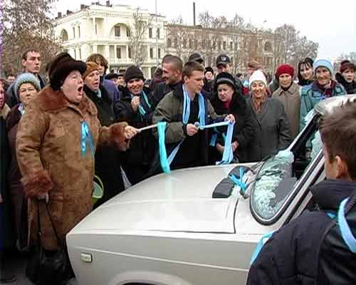 м. Севастополь. (Фото ТРК "Бриз" ВМС ЗС України). *** Тільки втручання спецназу, що розчистив коридор для проїзду автоколони, дозволило учасникам автопробігу "Поїзд дружби" 16 грудня в'їхати в місто-герой Одесу. До цього кілька десятків автомобілів з артистами і журналістами, що відправилися з Києва в інформаційну передвиборну поїздку на південь і схід України, простояли на в'їзді в місто майже 5 годин: траса була заблокована кордоном людей з символікою кандидата в Президенти України Віктора Януковича. Серед тих, хто перекрив трасу, були люди в нетверезому стані, на адресу артистів і журналістів вигукували образи. *** У ніч з 17 на 18 грудня на в'їзді в Крим, у районі Армянська, кілька сотень пікетувальників протягом 4-х годин блокували рух учасників автопробігу "Поїзд дружби". Пікетники тримали в руках російські прапори, скандували "Янукович!", кидали в автомобілі "Поїзда дружби" яйця, різали шини, зривали автомобільні номери... *** Прихильники кандидата в Президенти Віктора Януковича 21 грудня не пустили в Донецьк "Поїзд дружби", заблокувавши автомобілями в`їзд до міста. Учасники автопробігу - відомі журналісти, фотохудожники, музиканти, ді-джеї, кінематографісти, які запланували перед виборами відвідати 14 областей з метою налагодження контактів між регіонами України в ім'я збереження її територіальної цілісності, дотримання свободи слова і демократичних цінностей, Донецьк були вимушені обминути...