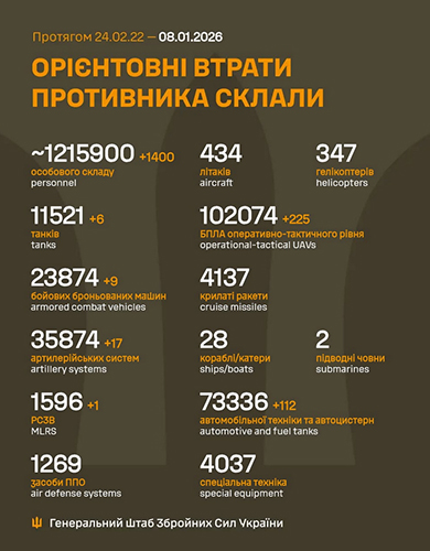 Ми з╕брали для вас ╕нформац╕ю про тисяча чотириста п’ятнадцятий день Велико╖ в╕йни: чим жили Укра╖на та укра╖нц╕ 8 с╕чня 2026 року.