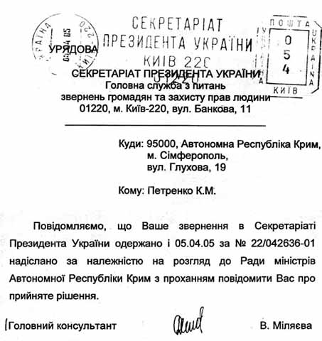Відразу зазначимо, що причиною цієї публікації могла б стати не обов`язково "Світлична" проблема. Власне, зовсім недавно наша газета описала схожу ситуацію, коли клерк з управління діловодства Кабінету Міністрів України "відфутболив" листа нашого земляка академіка Е. Джемілєва до Юлії Тимошенко із розробленими кримськими вченими пропозиціями, як створити модель антикризової стабілізації економіки підприємств. Ця модель дозволяла державі економити мільярди, але управління діловодства "похоронило" листа без розгляду, бо, мовляв, він оформлений з порушенням якихось вимог якоїсь постанови (а звідки автор листа, навіть якщо він академік, мав про ту постанову знати?). Зрозуміло, що бажання стукатися з ідеями у київські кабінети в наших земляків-академіків різко поменшало. Напевне, таке ж розчарування пережив і наш постійний передплатник і читач, інвалід війни Костянтин Михайлович Петренко із Сімферополя, коли на своє схвильоване звернення до перших осіб держави стосовно долі "Кримської світлиці" отримав ось таку листівку із Секретаріату Президента України...
