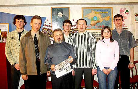 Ось цей молодий завзятий гурт сімферопольців на чолі з добре відомим нашим читачам із публікацій у "Світлиці" скульптором Йосипом Марчинським (він у центрі) нагрянув минулої п`ятниці до редакції, щоб висловити свою підтримку газеті. Знайомтеся: Юрій Ярентюк, інженер-технолог; Руслан Фещак, інженер; Святослав Соломко, викладач-філолог; Петро Німчук, гірничий інженер; Олеся Ямборко, психолог; Василь Катрич, інженер-технолог. Напевне, уже з промовистих прізвищ наших гостей зрозуміло, що українці в Криму таки є, і що не тільки прізвища, але й душі у них - українські, раз вони ось так дружно і молодечо підставили плече "Кримській світлиці"!