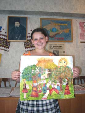 Цього літа Таня за перемогу в конкурсі була нагороджена путівкою до "Артеку". По дорозі до табору забігла у гості до "Джерельця" й подарувала нам свій малюнок "Помаранчевий цвіт родинного дерева" - як ілюстрацію до власного вірша. Фото В. КАЧУЛИ.